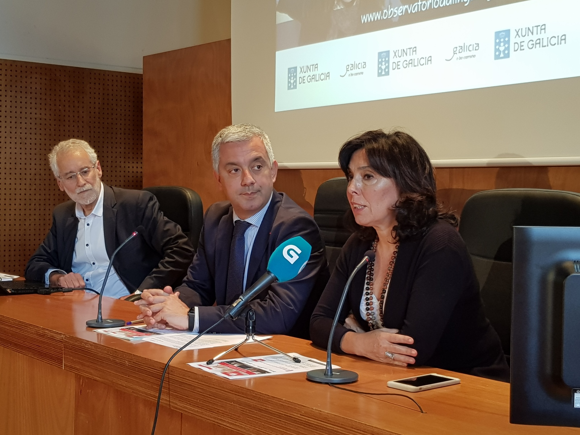 O secretario xeral de Política Lingüística, Valentín García, e a directora da Amtega, Mar Pereira, acompañados de Miguel Costas, representante da consultora Eosa, xestora do proxecto, presentaron hoxe ao mediodía en rolda de prensa a versión actualizada, á que xa se pode acceder no enlace www.observatoriodalingua.gal.