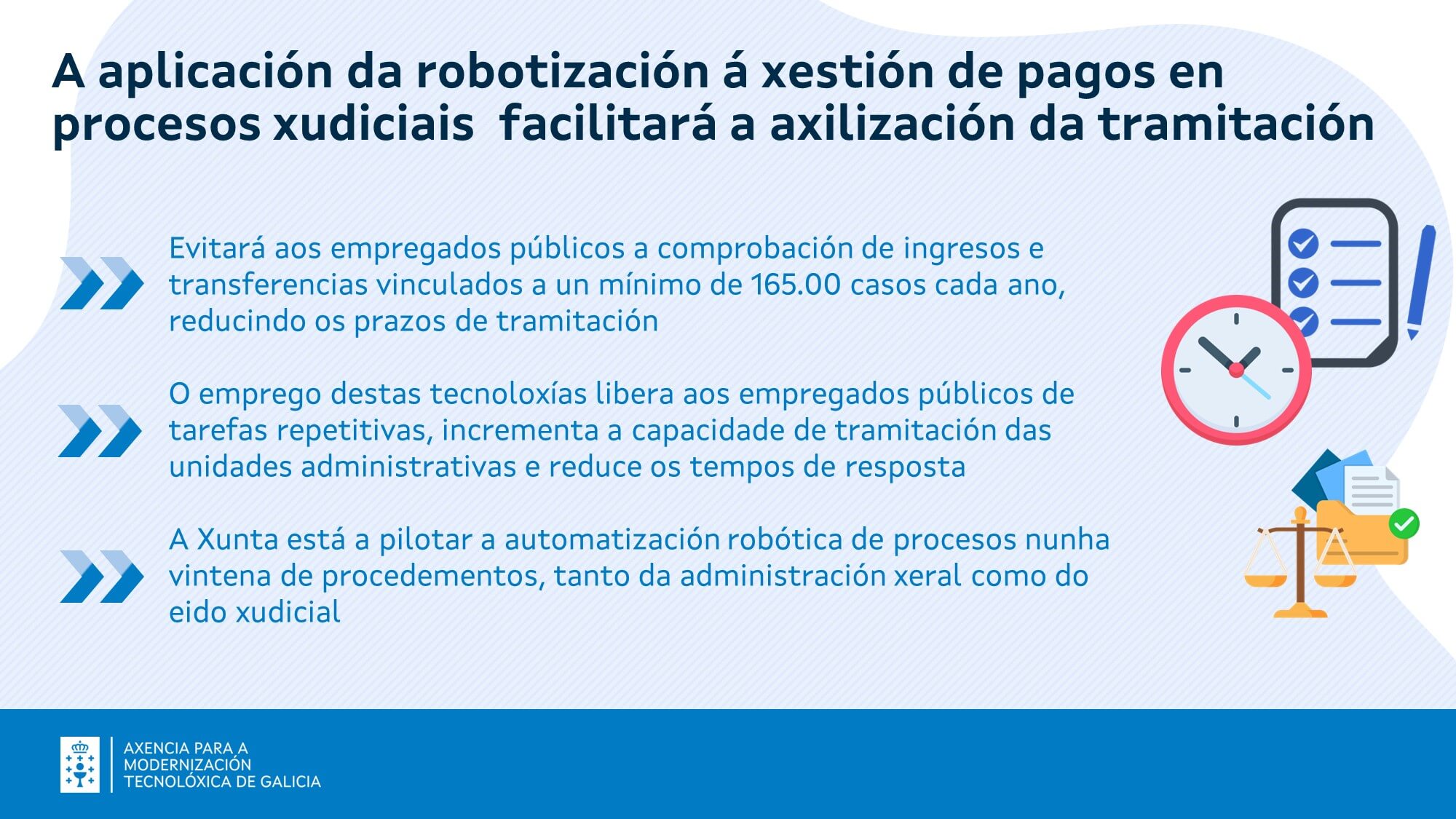 A Xunta está a pilotar a aplicación de tecnoloxías de automatización robótica de procesos (RPA) xestión de contas de consignación e depósitos xudiciais. O emprego desta tecnoloxía evitará aos empregados públicos a revisión de ingresos e transferencias vinculados a un mínimo de 165.000 casos anuais, que poderán dedicarse a tarefas de maior valor, reducindo os tempos de tramitación.