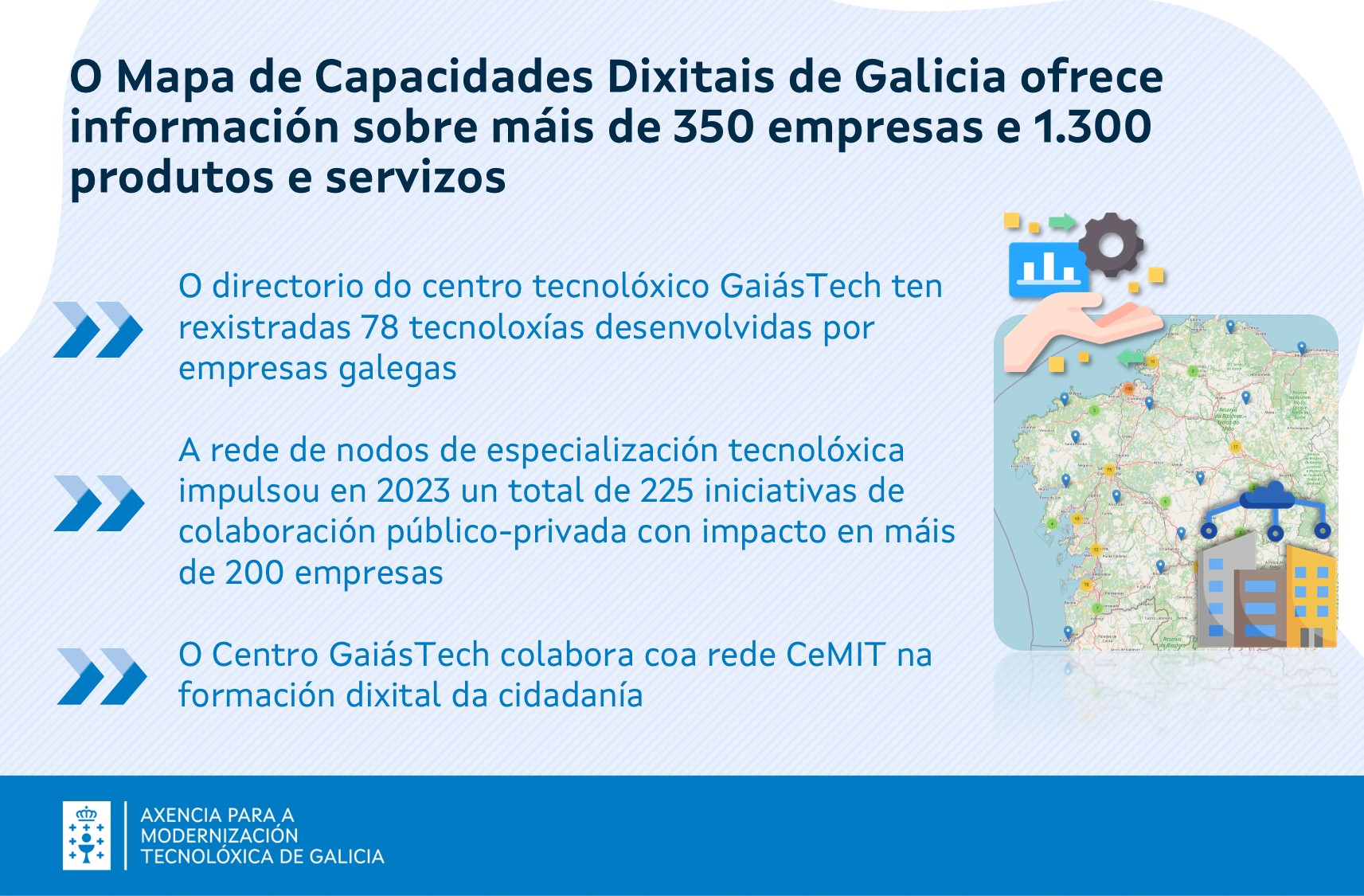 Máis de 350 empresas forman parte xa do Mapa de Capacidades TIC de Galicia que xestiona o centro GaiásTech da Cidade da Cultura. Estas empresas tecnolóxicas ofrecen un total de 1.335 produtos e servizos que empregan 78 tecnoloxías diferentes. Os datos forman parte do balance de evolución da Estratexia Galicia Dixital 2030 (EGD2030) elaborado pola Axencia para a Modernización Tecnolóxica de Galicia.
