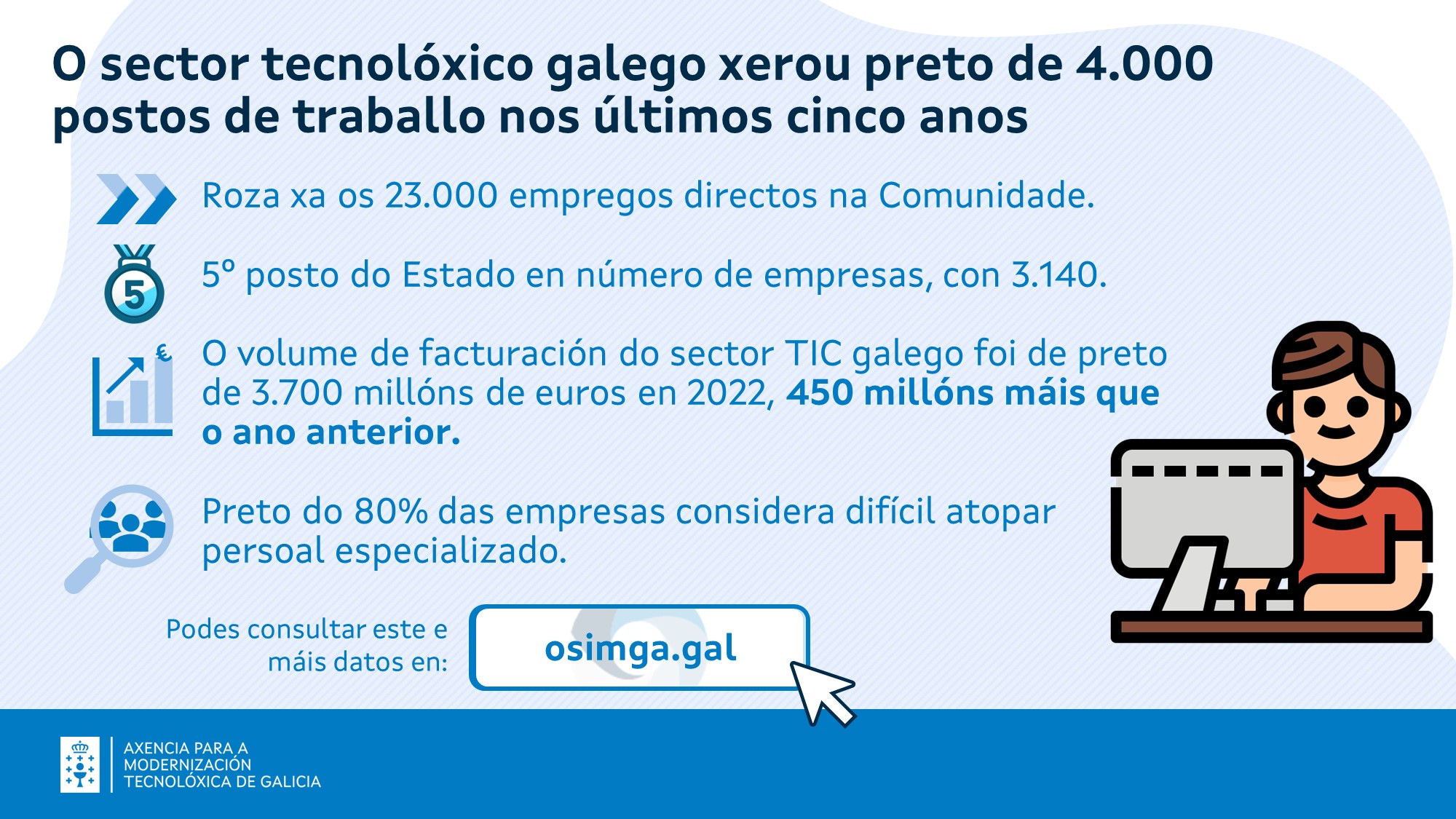O sector tecnolóxico galego xerou nos últimos cinco anos preto de 4.000 postos de traballo e pechou o 2023 con cerca de 23.000 empregos directos na Comunidade. O número de empresas tamén mantén un ritmo de crecemento constante nos últimos anos e suma 3.140, o que mantén á Comunidade no quinto posto da clasificación estatal. Son datos recollidos no informe do Observatorio da Sociedade da Información de Galicia (Osimga), “O Sector TIC en Galicia 2023”, publicado hoxe.
