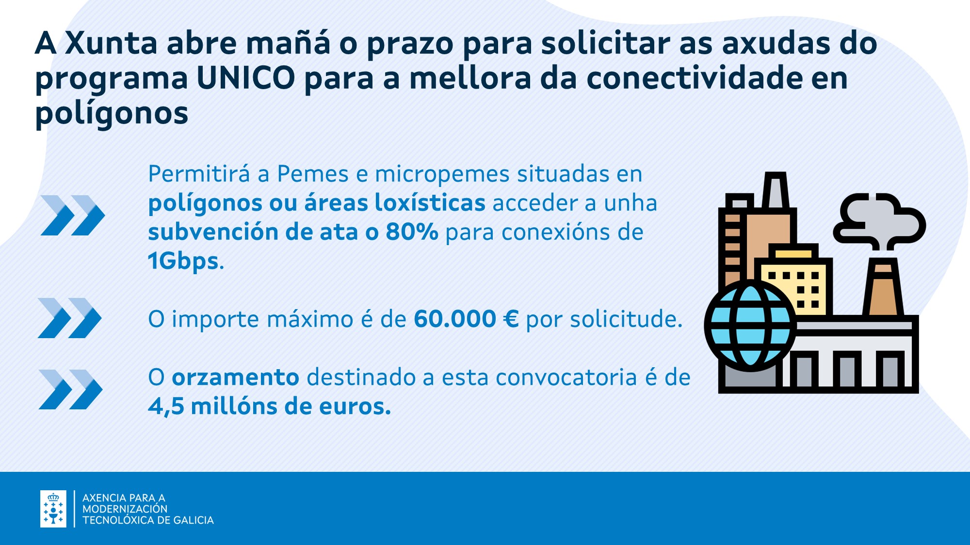 A Xunta de Galicia publica hoxe no Diario Oficial de Galicia a liña de axudas do programa estatal UNICO para mellorar a conectividade en polígonos empresariais. Desde mañá e ata o 16 de setembro Pemes e micropemes situadas en polígonos, centros loxísticos ou áreas de alta concentración empresarial poderán solicitar esta subvención para dispoñer de conexións de 1Gbps.