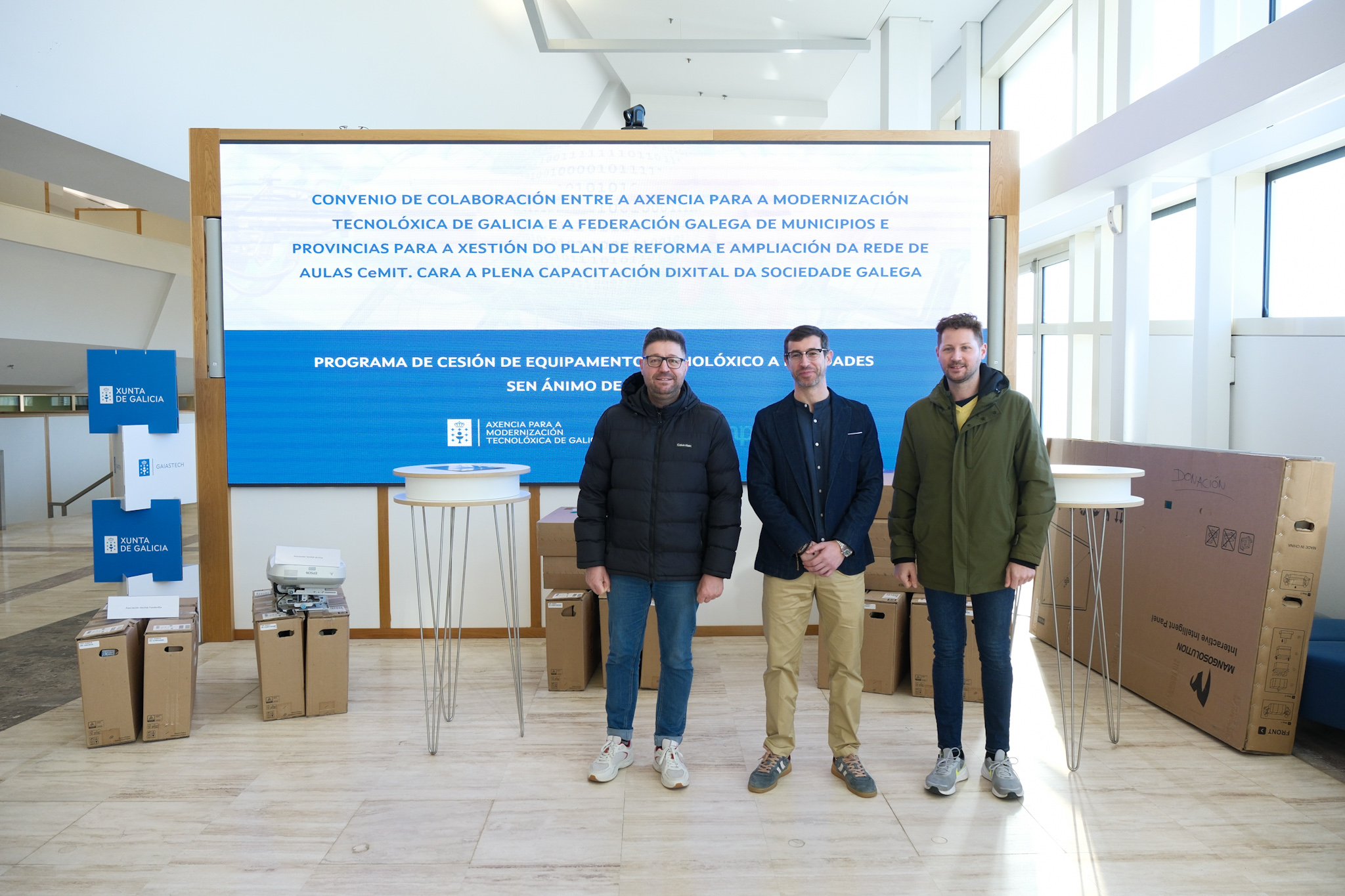 A cesión deste material, propiedade da Xunta, está enmarcado no convenio de colaboración para a xestión do plan de reforma e ampliación da Rede de Aulas CeMIT, subscrito pola Axencia para a Modernización Tecnolóxica de Galicia e a Federación Galega de Municipios e Provincias (Fegamp).